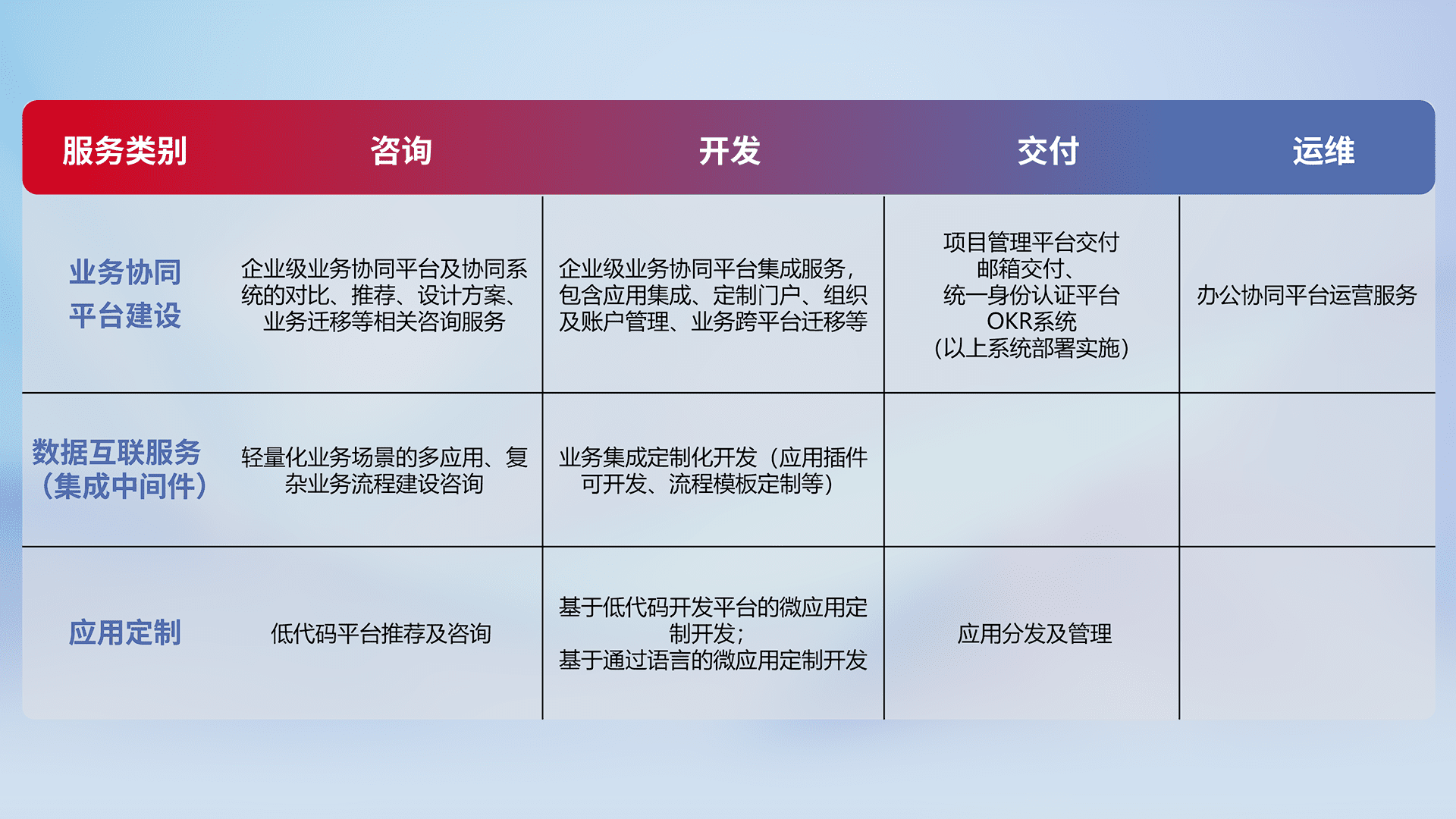 针对钉钉、、、企微、、、、IDaas等平台级产品提供产品的规划、、、方案、、交付、、、定制化开发等服务,,实现如统一协同办公、、、、智能客户服务、、、混合会议管理、、智能数据查询、、、、等业务场景,,实现数字化转型。。。。